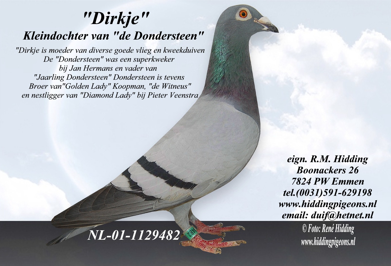 Kleindochter Dondersteen is een geweldige Kweekduivin. Haar eerste jong was de 169 die in PV the Flying Dutchman in Emmen 3 maal een eerste vloog. Zij heeft diverse goede duiven gegeven. Zo is zij ook de moeder van de 480 en 481 bij Gerrit Jager in Emmen. Dit zijn echt 2 topduiven!!!. De 728 is een kleindochter van haar en die werd als jong meteen 1e duifkampioen met tevens een eerste in de kring van 3300 duiven. De 601 is ook een kleindochter van haar. Zij werd in 2011 1e vitesseduif van het samenspel.