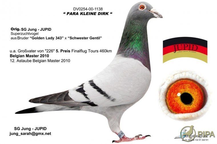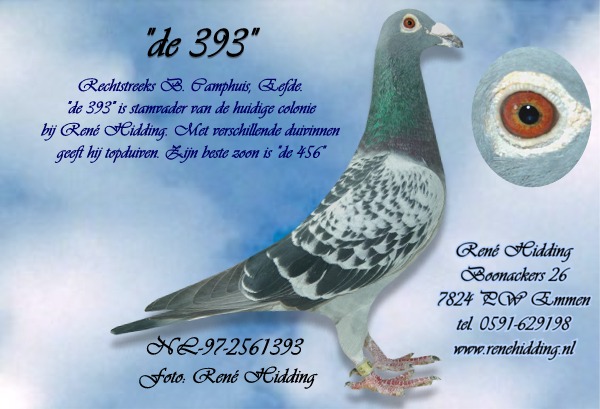 De beste Camphuisduif werd uiteindelijk de 393. Dit was eigenlijk een vreemde eend in de bijt, want in de meeste duiven van Camphuis komen wij de bekende namen als “oude 05”, “James bond” enz. tegen. In de afstamming van “de 393” ontbreken deze echter. De 393 was een van Loon duif. Hij kwam uit een duif die Bertus kocht op de verkoop van de gebr. La Grouw die een broer was van de beste vitesseduif WHZB. De moeder was ook een van Loon duif via Eijerkamp. Ik ben de enige die een jong had uit deze koppeling. De 393 stond altijd tegen “de 535” en hun beste zoon was “de 456”. Momentheel heb ik nog 1 zoon uit koppel 1 en die geeft regelmatig bruikbare duiven. Uit de 456, kwam “de 032” die als jong meteen een 3e nationaal Houdeng scoorde tegen 20143 duiven. Deze 032 bleek naast een goede vlieger, 3 eerste prijzen, ook een zeer goede kweker. Diverse kinderen werden duifkampioen in Emmen en wonnen eerste prijzen. Via Bertus kwamen ook nog duiven op het hok van wijlen Henk Gerritsen, uit een zoon uit het superkoppel, en Koopmanduiven. De Koopmanduiven kreeg Bertus door contacten met andere liefhebbers, zoals o.a. de toenmalige comb. Seelbach-Jung uit Duitsland. Deze combinatie bestaat intussen niet meer en heet nu Jung Jupid. Deze combinatie had toen voor een vermogen aan duiven bij Koopman gekocht. Bertus leende in 2001 een doffer die Jung “Para Dirk” noemde.