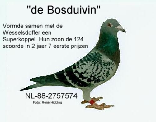 Waren de duiven waarmee ik serieus de duiven sport instapte. In 1988 kreeg ik van Geert Wessels uit Bargeroosterveld, een laat jong uit diens bekende “089”, een kweker van formaat en waarvan nu nog de nazaten met regelmaat van de klok kampioenen en eerste prijswinnaars afleveren. De Wesselsdoffer ontpopte zich op mijn hok als een supervererver. In eerste instantie werd hij gekoppeld aan”de Helmstedtduivin” en hieruit kwamen direct bruikbare duiven, duiven die binnen de eerste 100 in groot verband konden vliegen. In een later stadium werd hij gekoppeld aan “de Bosduivin”. Deze duivin kreeg ik van Jan Bos uit Emmen, een liefhebber die in die tijd ook een hok vol met goede duiven had. Ook bij Jan lag de “089” van Gerard Wessels aan de basis van succes. Bij de koppeling “Wesselsdoffer” maal “Bosduivin” kunnen we spreken van inteelt.